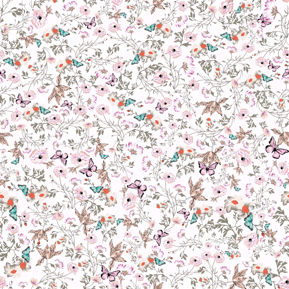 The fabric features a delicate floral print with small flowers and subtle earthy accents, giving it a vintage, gentle feel. The neckline has a gathered, slightly ruffled detail that adds a classic, smocked-style look, and the sleeves are loose with gentle cuffs at the wrists for comfort.